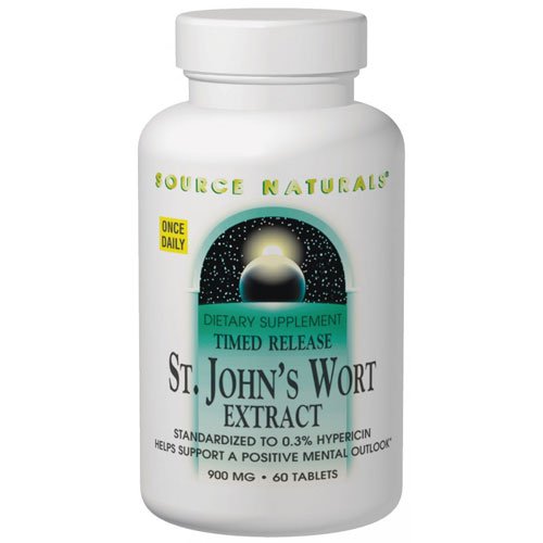 Dietary supplement. Standardized to 0.3% Hypericin. Helps support a positive mental outlook. Source Naturals Time Release St. John's Wort Extract is a once daily tablet formulated to gradually be released over a 12-hour period and is standardized to consistently supply 0.3% hypercin. A daily intake of St. John's wort, standardized to 2.7 mg hypercin, may support a positive outlook and mood. Benefits may be experienced within 4 to 6 weeks of initial use (These statements have not been evaluated by the Food and Drug Administration. This product is not intended to diagnose, treat, cure or prevent any disease). Suitable for vegetarians and hypoallergenic: Contains no yeast, dairy, egg, gluten, corn, soy, or wheat. Contains no sugar, starch, salt, preservatives, or artificial color, flavor or fragrance.